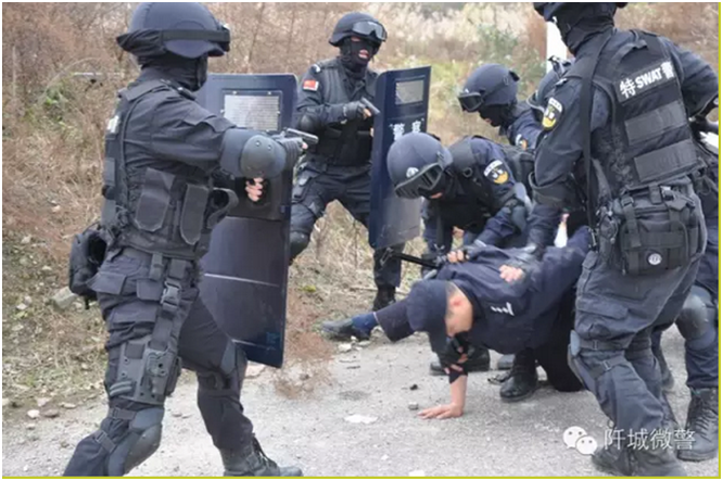 在演練現(xiàn)場,2名喬裝成警察的“歹徒”在通往一鄉(xiāng)鎮(zhèn)的公路上設(shè)卡,借口例行檢查,持槍對一輛有“鎮(zhèn)東護運”字樣的運鈔車實施“搶劫”,在與押運人員交談中,不料卻被押運人員識破其“詭計”,2名“歹徒”原形畢露,立即開槍射擊,就在這一瞬間,押運人員依法開槍將其中一名“歹徒”“擊傷”并迅速駕車至安全區(qū)域。同時,電話向警方報警求助。隨后,警方快速集結(jié)特警、巡警等30余名警力前往處置,通過喊話和政策攻心,2名“歹徒”仍然負隅頑抗,并向特警開槍。在勸說無效的情況下,指揮員下達對持槍“歹徒”采取強制措施的命令。歷時8分鐘,特警成功將2名“歹徒”制服并抓獲,隨即在醫(yī)護人員的幫助下,將“受傷”“歹徒”抬上救護車,送往醫(yī)院……